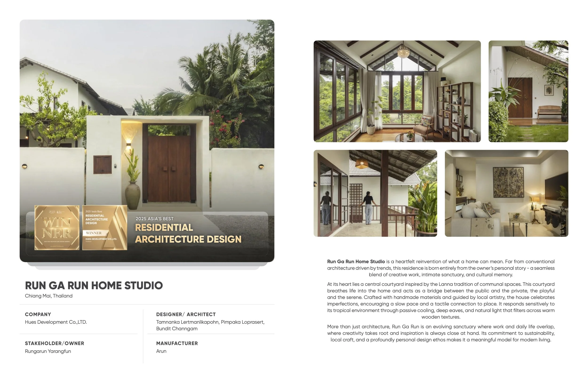 We’re proud to share that Run Ga Run Home Studio (Chiang Mai, Thailand) by HUES Development Co., Ltd. has been named a Winner at the 2025 Asia Architecture Design Awards, receiving “2025 Asia’s Best – Residential Architecture Design (Thailand).”